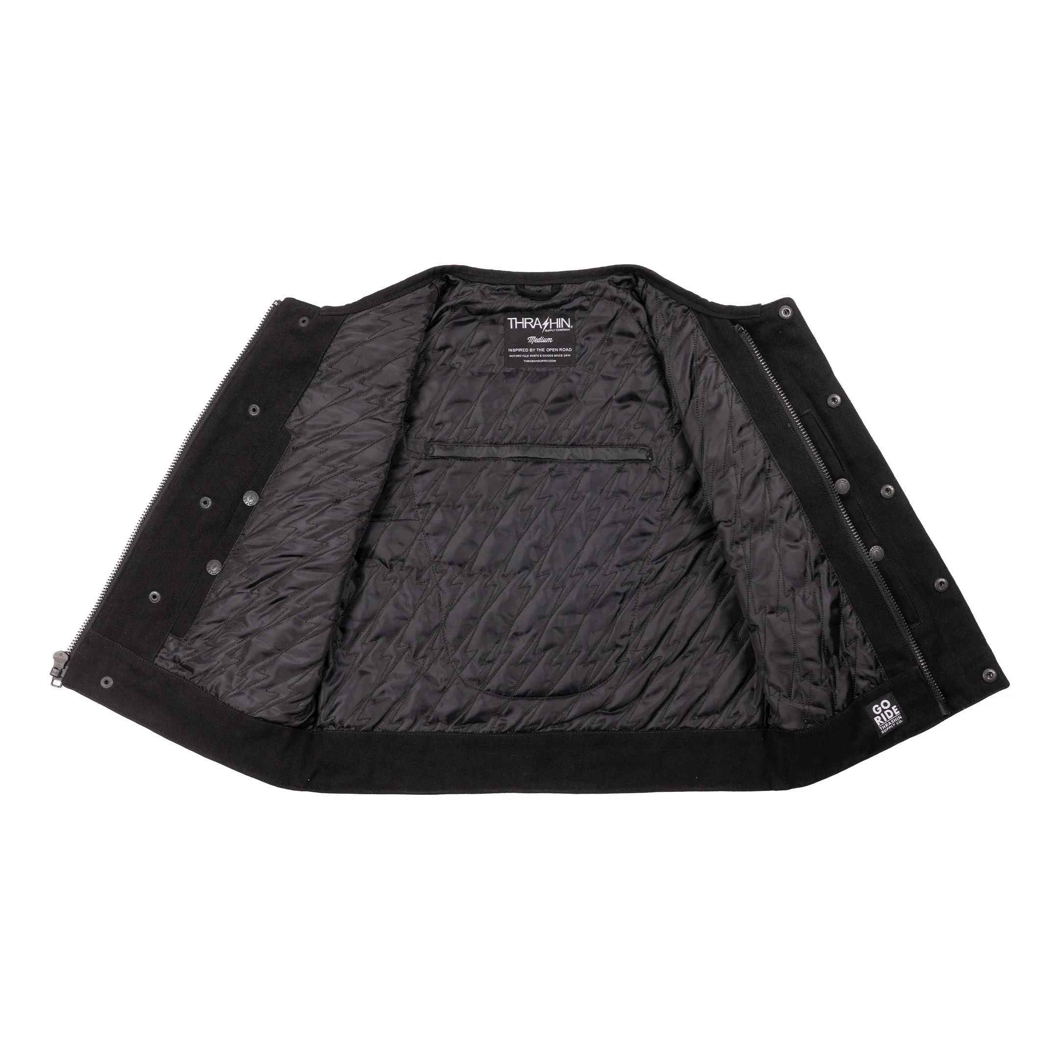 The THRASHIN® Potrero Denim Riding Vest is 3-inches shorter than our standard riding vests. This vest is made from heavy denim and features a rolled collar, quick access concealed carry pocket, zipper front slash pockets, and black on black finishes.